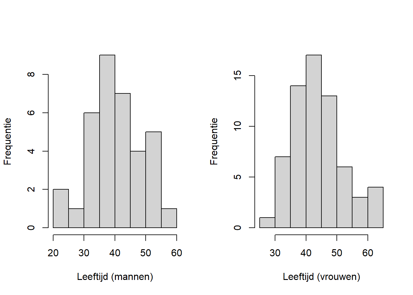 Eerder hebben we in onze dataset gekeken wat de gemiddelde leeftijd is van de mannen en van de vrouwen. Stel dat we willen toetsen of deze twee groepen statistisch significant van elkaar verschillen. Hiervoor kunnen we, mits deze variabele voor allebei de groepen normaal verdeeld is, een onafhankelijke t-toets doen. We gaan eerst eens kijken naar de normaliteit van de variabele leeftijd, zowel voor de mannen als voor de vrouwen. Om te beginnen, maken we voor de mannen en voor de vrouwen een histogram: