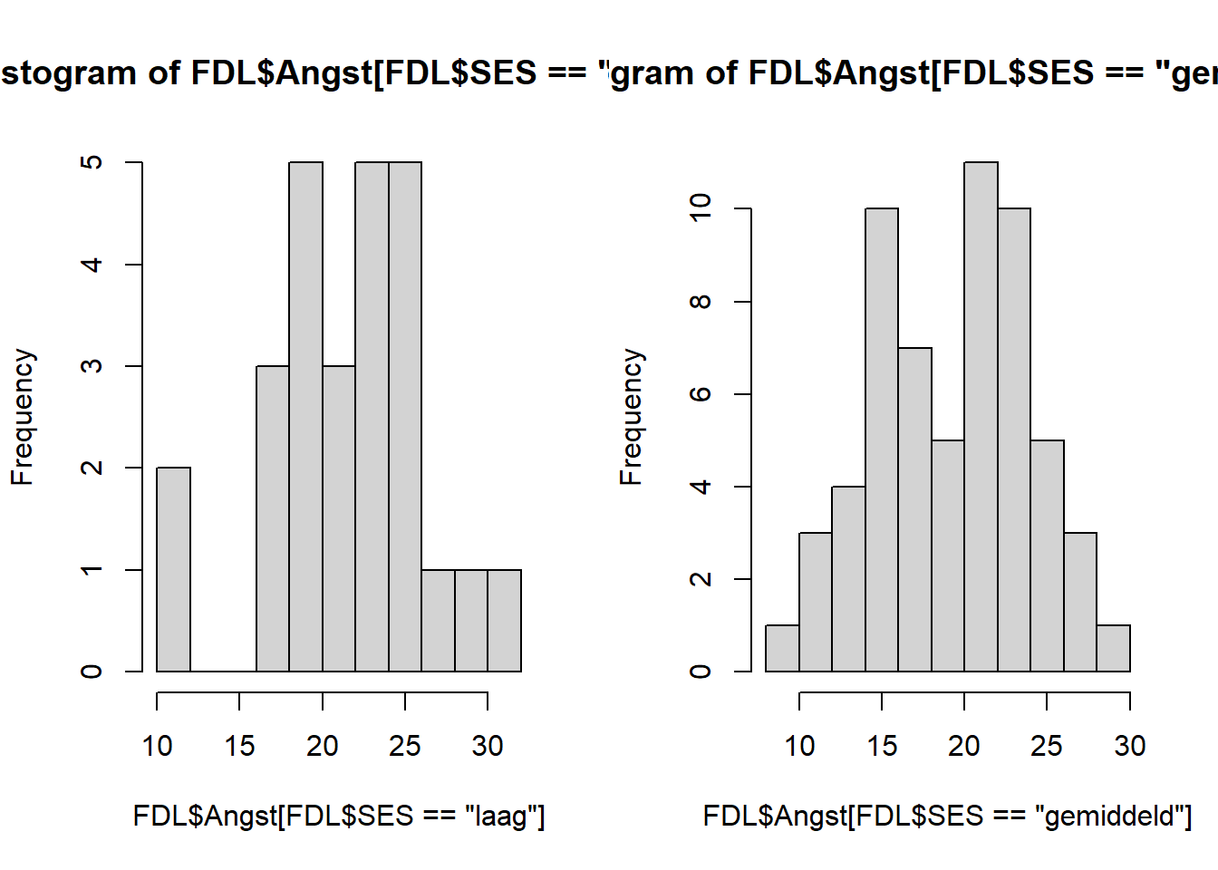 Misschien is de derde optie het elegantst: er zit geen herhaling in wat betreft Terug naar het resultaat. We zien dat er een t-test wordt uitgevoerd met een zogenaamde Welch-correctie. Een Welch Two Sample t-test. Deze pas je toe als je er niet van uit gaat dat de varianties in beide groepen gelijk zijn (als de spreiding ongelijk is). Deze toets levert ons een t-waarde op van -2.11, wat met 68.41 vrijheidsgraden een p-waarde van 0.04 oplevert. Omdat de p-waarde hier kleiner is dan 0.05, concluderen we hier dat de mannen en vrouwen statistisch significant verschillen in leeftijd. Verder wordt er een betrouwbaarheidsinterval van het verschil gegeven, en zien we de gemiddelden van de groepen terug. We maken eerst twee histogrammen voor de angst-schaal: voor elke groep eentje. We zetten ze naast elkaar d.m.v.