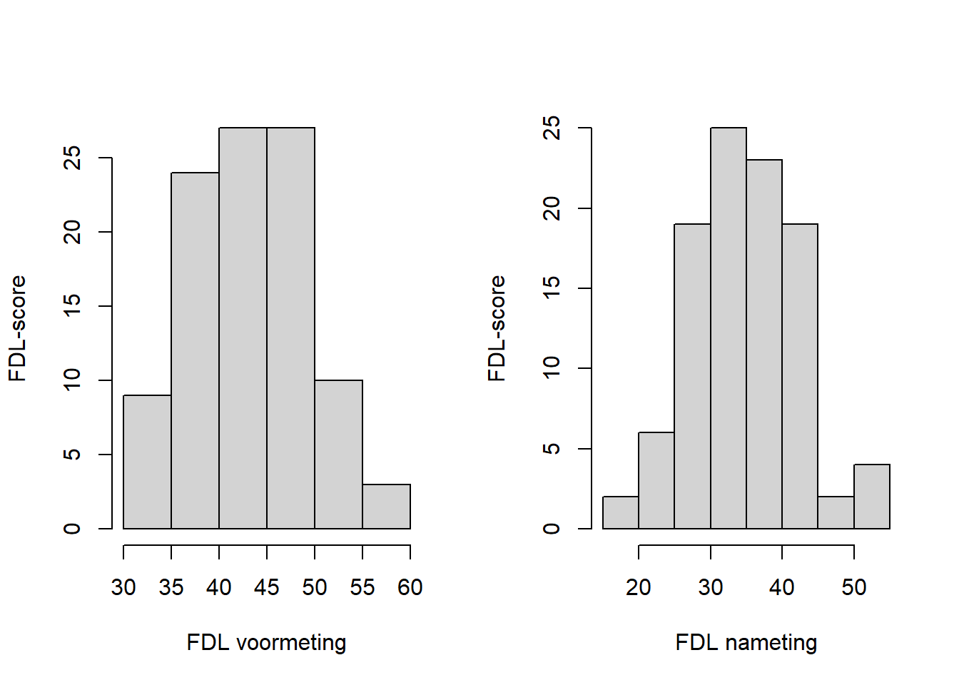 Stel, we willen weten of er een verschil is tussen de voor- en de nameting van de FDL. Ook dan kijken we eerst naar de normaliteit rond beide gemiddelden: