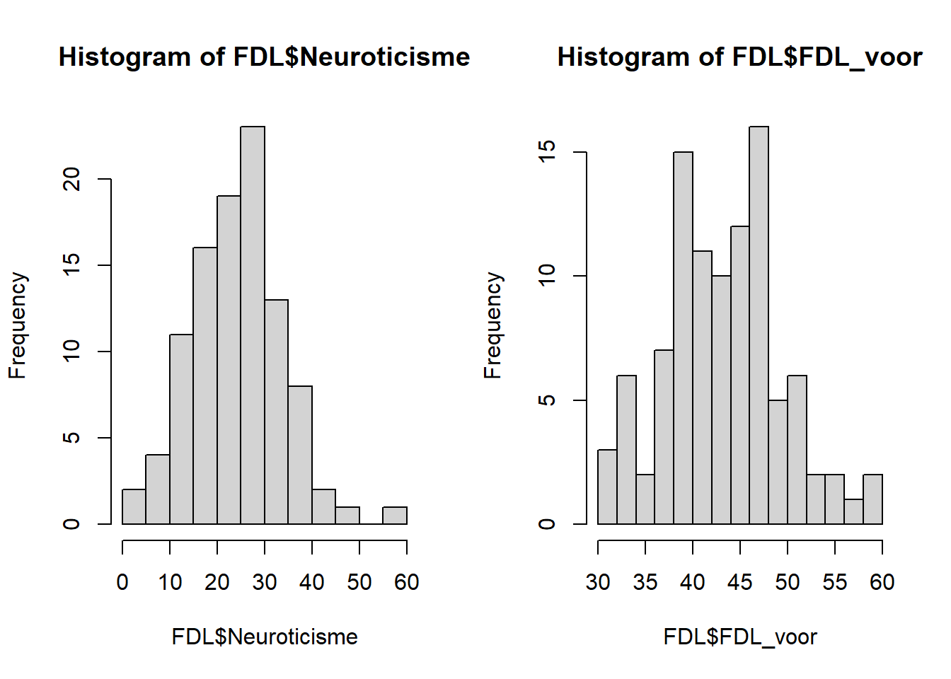 Als we de samenhang tussen twee continue variabelen willen onderzoeken, kunnen we een correlatietoets doen. Zijn beide variabelen in je vraag ongeveer normaal verdeeld, dan kunnen we een Pearson-correlatie berekenen, en als één van beide of allebei de variabelen niet normaal verdeeld zijn, kunnen we een Spearman rangcorrelatie berekenen als zogenaamd “nonparametrisch alternatief”. Voor het eerste voorbeeld berekenen en toetsen we de correlatie tussen neuroticisme en de FDL-score bij de voormeting. Eerst gaan we eens kijken hoe ’t zit met de verdeling van beide variabelen.