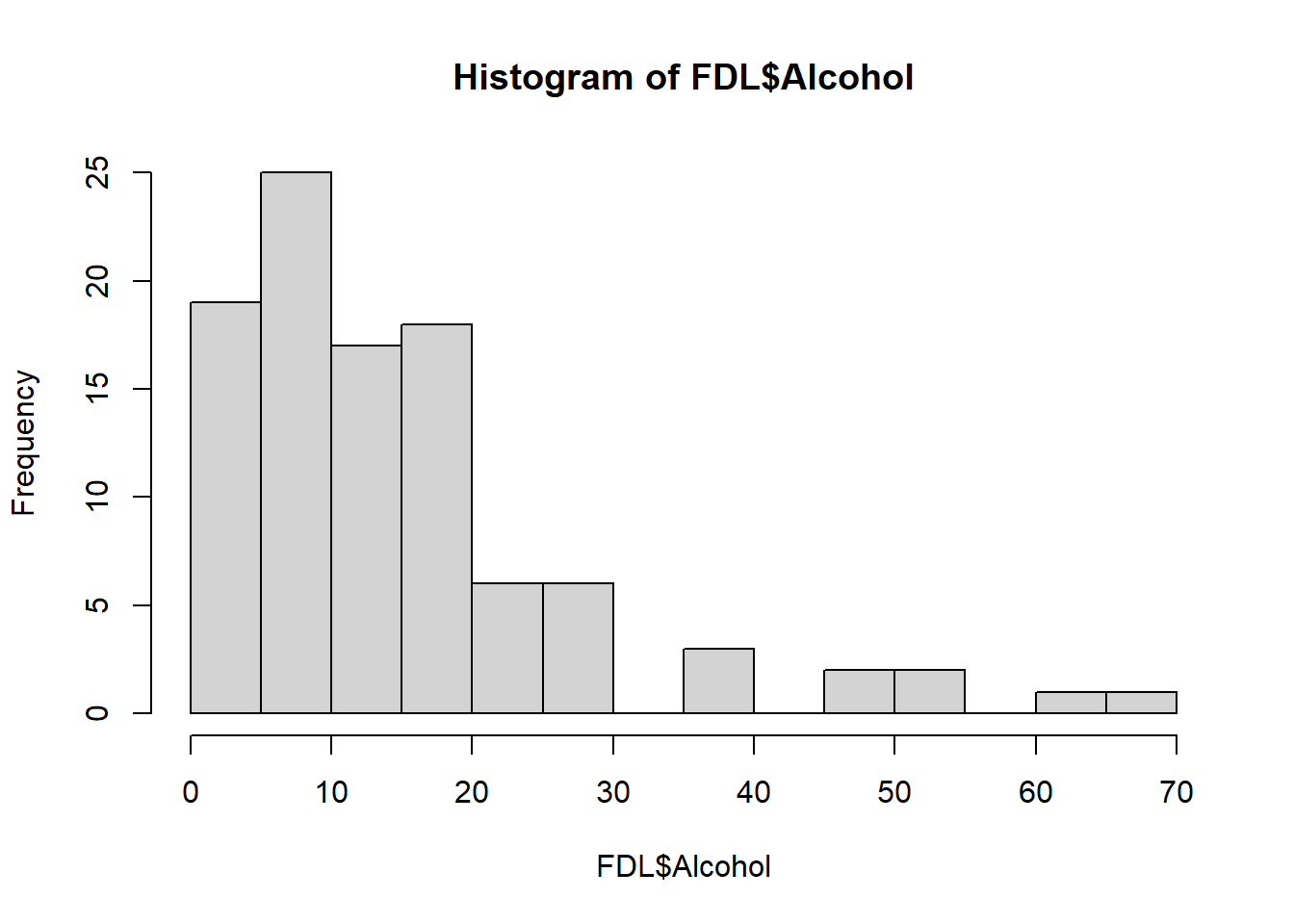 We krijgen een melding “Cannot compute exact p-value with ties”. Deze melding kunnen we negeren, er wordt voor ons blijkbaar geen exacte p-waarde berekend, maar een benadering ervan. We vinden een redelijk (‘medium’) verband tussen alcoholgebruik en de voormeting van de FDL (\(\rho\) = 0.38), welke statistisch significant is (p < .001). |