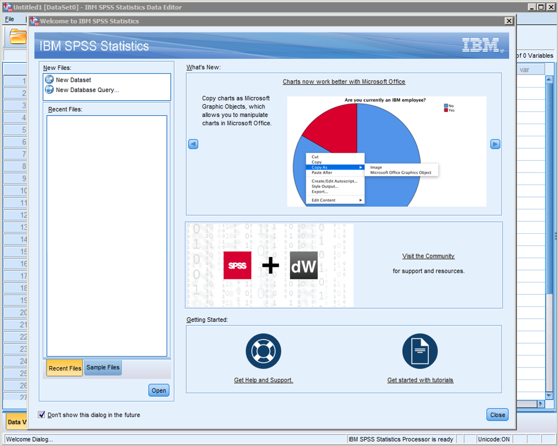 Het is aan te raden om linksonderaan “Don’t show this dialog in the future” aan te vinken. Het opstarten van SPSS duurt, zoals je misschien merkte, al lang genoeg… We kiezen voor “New Dataset” en klikken op “Close”. Het scherm dat je hierna ziet, zal er ongeveer zo uit zien: