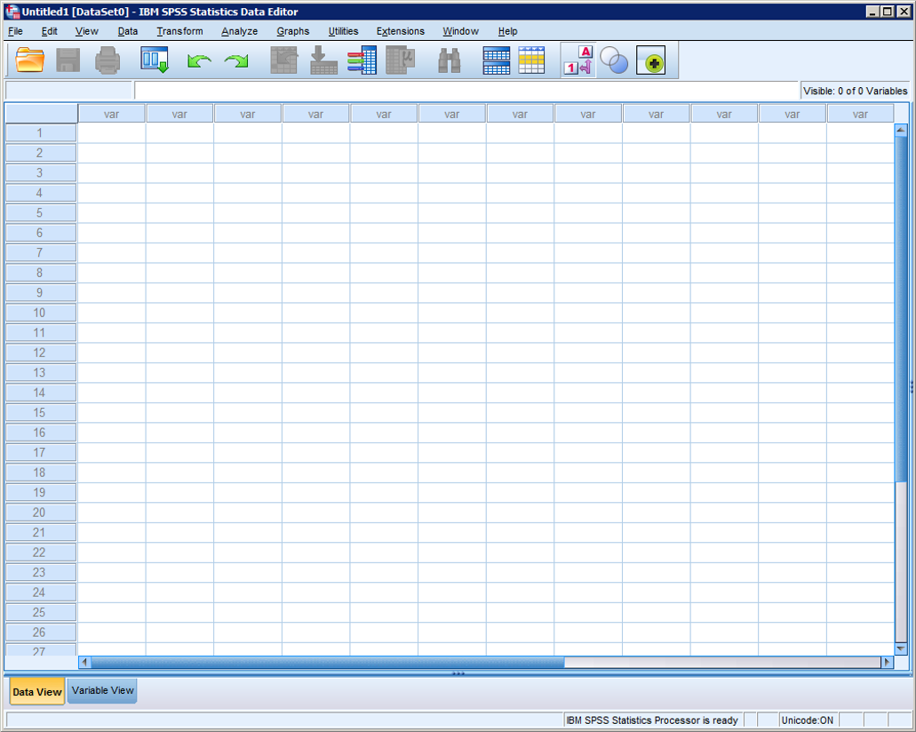 We zien lege cellen, daarboven een knoppenbalk en een menustructuur, en onderaan het scherm valt te zien dat er twee tabbladen zijn: “Data View” en “Variable View”. In Variable View zien we de eigenschappen van variabelen, waarvan we in Data View de ruwe data zien. Als we een nieuwe variabele aanmaken in Variable View, kunnen we deze bepaalde eigenschappen geven (waarover straks meer), vervolgens kunnen we onder Data View daadwerkelijk data invoeren.