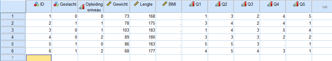 Opdracht: maak onze tutorialdataset af door een variabele voor gewicht (naam “Gewicht”), lichaamslengte (“Lengte”), BMI (“BMI”)) en vijf vragen uit een fictieve vragenlijst (“Q1” t/m “Q5”) aan te maken. De vijf vragen hebben vijf oplopende antwoordcategorieën “Helemaal mee oneens”, “Mee oneens”, “Neutraal”, “Mee eens” en “Helemaal mee eens”, met als respectievelijke waarden 1, 2, 3, 4 en 5. (Tip: maak deze values voor Q1 aan, en copypaste ze naar Q2 t/m Q5). Denk zelf na over aantal decimalen, meetniveau, label en type.