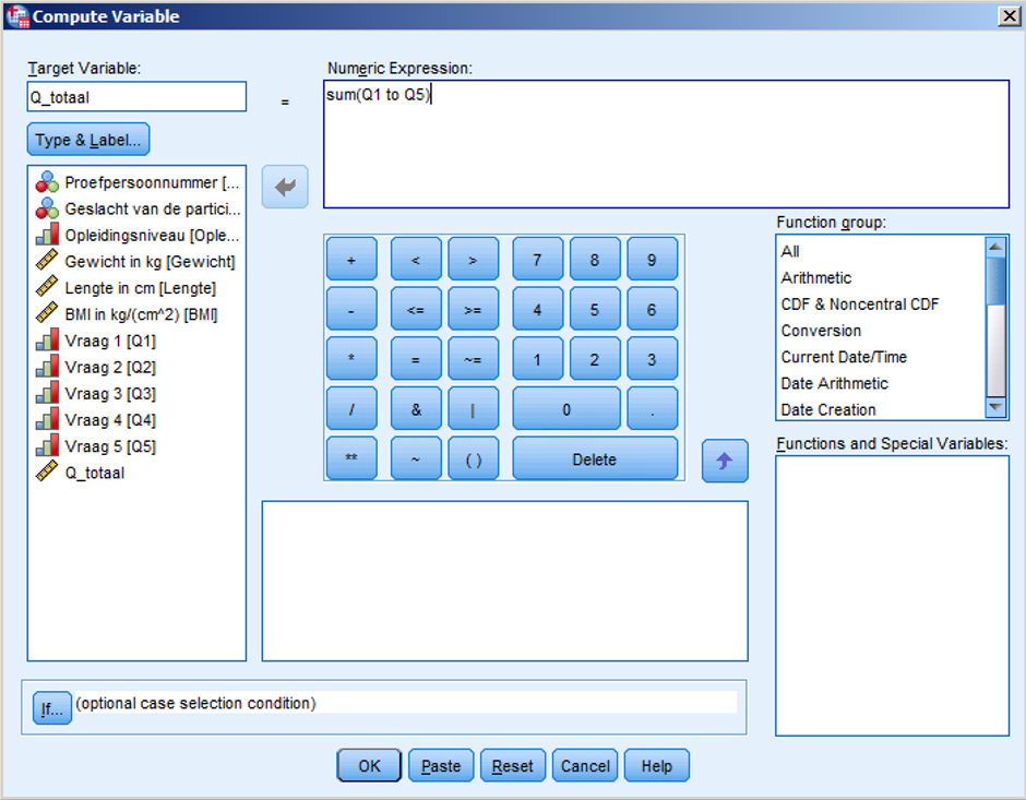 Opdracht: maak de variabele Q_totaal2 aan, door in Numeric Expression in te vullen: Q1 + Q2 + Q3 + Q4 + Q5. Vergeet niet de naam van de Target Variable te veranderen in “Q_totaal2”! Wat is het verschil in uitkomst met de eerdere methode voor “Q_totaal”? Wat zijn de voordelen en gevaren van het gebruiken van de eerste en de tweede methode? Hoe kun je dit oplossen?